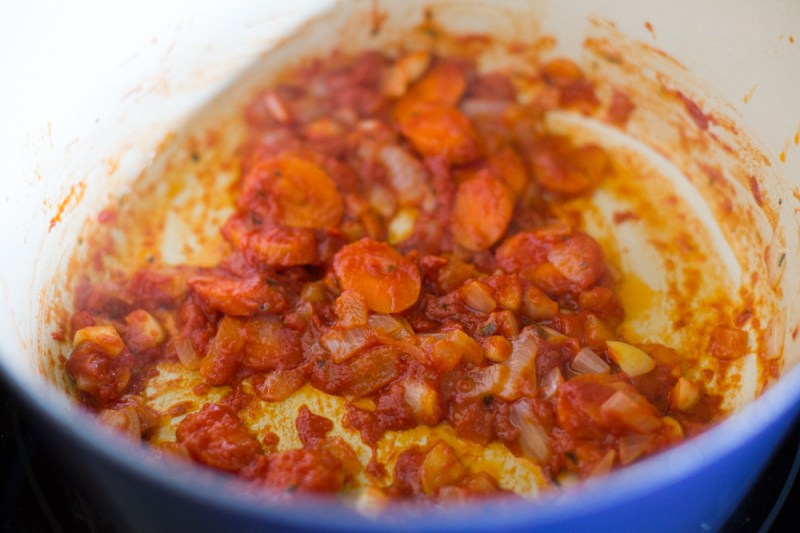 1. In a stockpot or Dutch oven, warm the butter over medium heat, then add the chopped onion and carrot; sauté until softened, about 5 minutes. Add the garlic and sauté until aromatic, about 1 minute, then add the brandy (or white wine if you don’t have brandy). Cook, stirring often, until the liquid has evaporated, about 2 minutes, then add the tomato paste. Stir together and sauté until aromatic, then add the rice and stock.