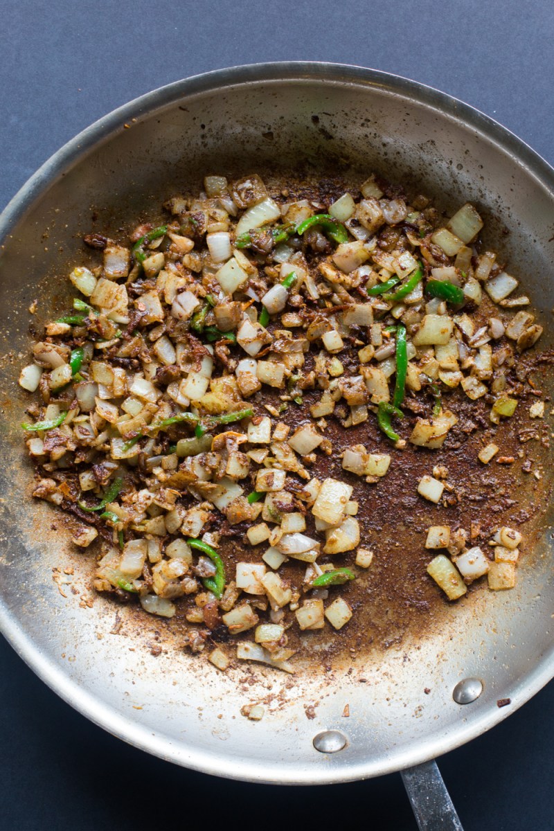 3. Reduce the skillet heat to medium, then add the onion. Saute until softened, about 3 minutes, then add the garlic, jalapeno, and the remaining curry blend; saute until aromatic, about 30 seconds.