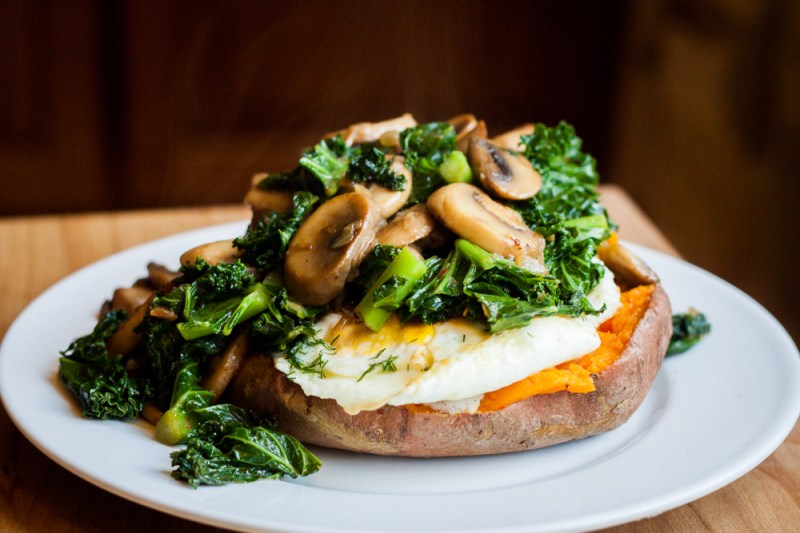 Remove the sweet potato and cut in half lengthwise. Place the eggs on top of the potato and pour the remaining ghee on top. Top with the kale/mushrooms/onion monstrosity.