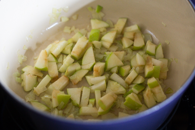 In a pot, warm the butter or oil on medium heat for a minute, then add the garlic. Sauté until aromatic, about 30 seconds, then add the diced onion. Sauté the onion until softened, about 5 minutes, then add the apple and sauté for another minute.
