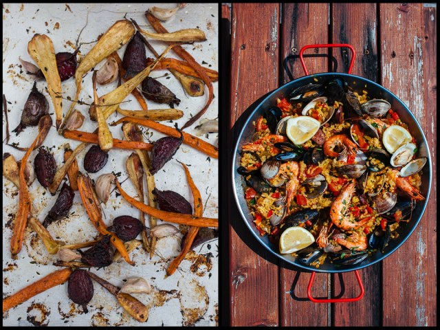 Roasted Root Vegetables, Seafood Paella
