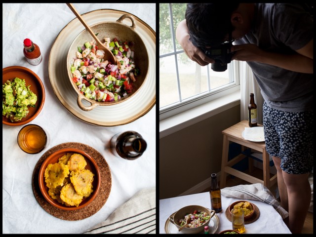 Giang shooting Shrimp Ceviche, Guacamole, and Tostones