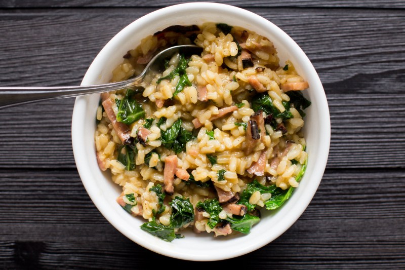 So here we are, five days after Christmas, and you’re probably wondering what to do with the leftover holiday ham in your fridge. After all, there are only so many ham soups you can make before they get tiring (and I’m a big fan of ham soups). As I was thinking about everyone’s ham problem yesterday, I put together this ham and kale risotto for lunch. I thought you folks would enjoy it as well.