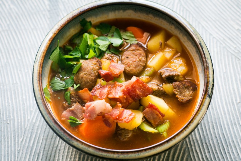 2. As the beef is cooking, cut and prepare your veggies, and cook the bacon until crispy, and brown the sausages (use a bit of bacon grease when browning them); set everything aside. Once you uncover the Instant Pot, fish out the beef and bones with some tongs. Spoon out the marrow and enjoy it as you finish the recipe – we spread it onto rice crackers to munch on as we cooked. Slice the rest of the meat into bite-sized pieces. Add the potatoes and squash and simmer for 10 minutes, then add the carrots and simmer for another 5 minutes, then add the celery and simmer for 5 more minutes. Add the beef and sausage to the pot, then taste and add salt and pepper if needed. Serve garnished with bacon pieces and chopped parsley.