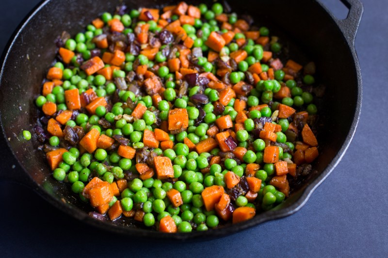 3. About 10 minutes before the potatoes are ready, let’s finish the mix-ins. Increase the skillet heat to medium, then add the garlic and jalapeño. Sauté until fragrant, about 30 seconds, then add the carrots. Sauté until the carrots are softened, about 4 minutes, stirring occasionally; stir in the garam masala, curry powder, salt, and white pepper, then gently stir in the peas and remove from heat.