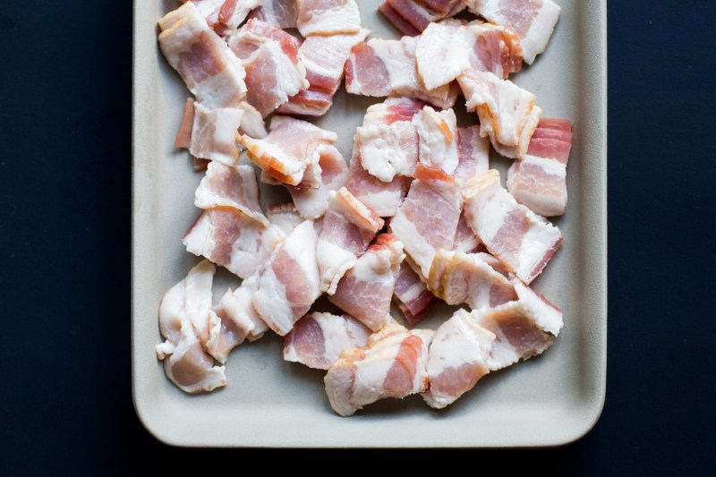 1. Heat a stainless steel skillet over medium heat, then add the bacon. Cook until crispy and the fat has rendered, about 10 minutes, moving the bacon pieces occasionally so that they cook evenly. As the bacon cooks, pre-heat the oven to 400F and slice the brussels sprouts.