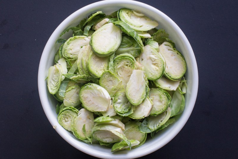 Slicing the brussels sprouts is probably the most labor-intensive step in this recipe, but it definitely helps to cut the cooking time and give you more surface area (which = more tasty browned bits).