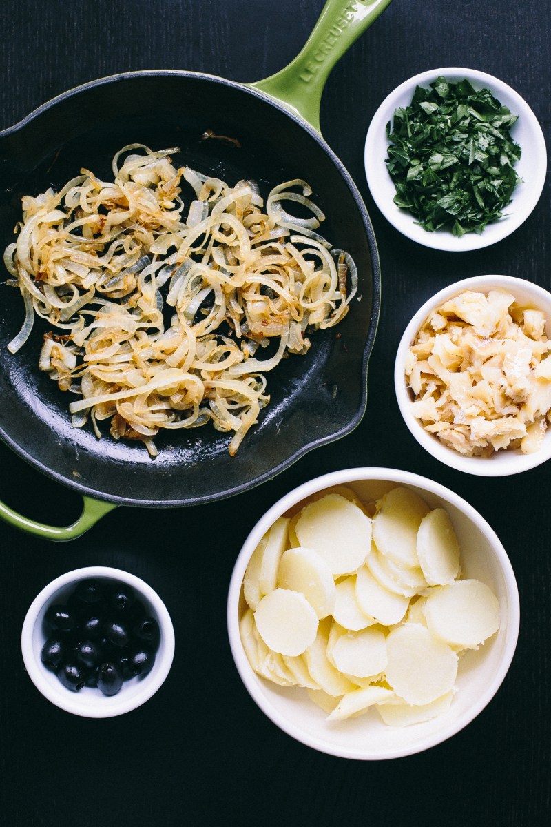 5. Preheat the oven to 350F. Add half of the potatoes to a casserole or gratin dish, then layer half of the fish, black olives, parsley, and caramelized onions on top. Repeat with the remaining ingredients. Bake until golden and slightly crisped, about 30 minutes, then serve with egg and lemon wedges.