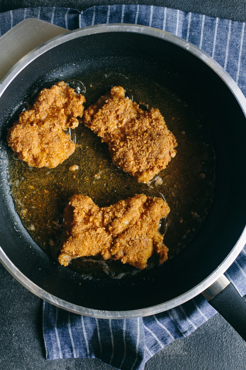 3. Fry the chicken. Increase the skillet heat to medium. To bread the chicken, dust a thigh in the potato starch mixture, then dredge in the eggs, then coat with the crushed pork rinds and transfer to the skillet. Repeat this process until you have filled the skillet (3-4 thighs should do it). Pan-fry the chicken until golden brown and cooked through, about 4 minutes per side, turning every 2 minutes. Place the cooked chicken on a plate lined with paper towels, then transfer to the oven to keep warm as you prepare your next batch(es).