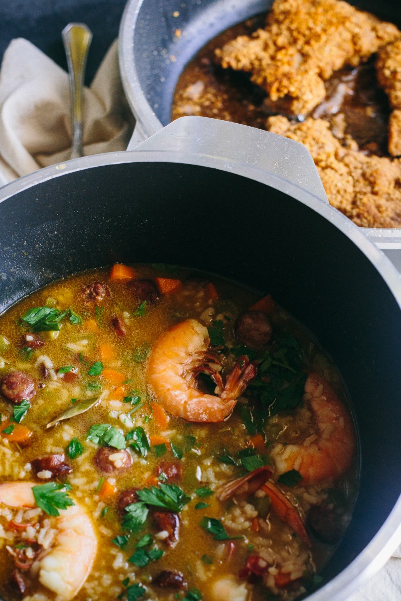 The second reason this recipe is unique is because it is actually two dishes in one. Both the Boneless Fried Chicken and Carolina Shrimp Bog would be excellent on their own, but a) I wanted to highlight two distinct pieces of cookware, and b) I was drawn to the challenge of writing you through the process of building two dishes at once. Crafting a single recipe is relatively easy, but balancing multiple dishes to create one whole meal is more reflective of how most of us spend time in the kitchen; I hope this week’s recipe will give you some insight into how I tackle multiple tasks simultaneously.