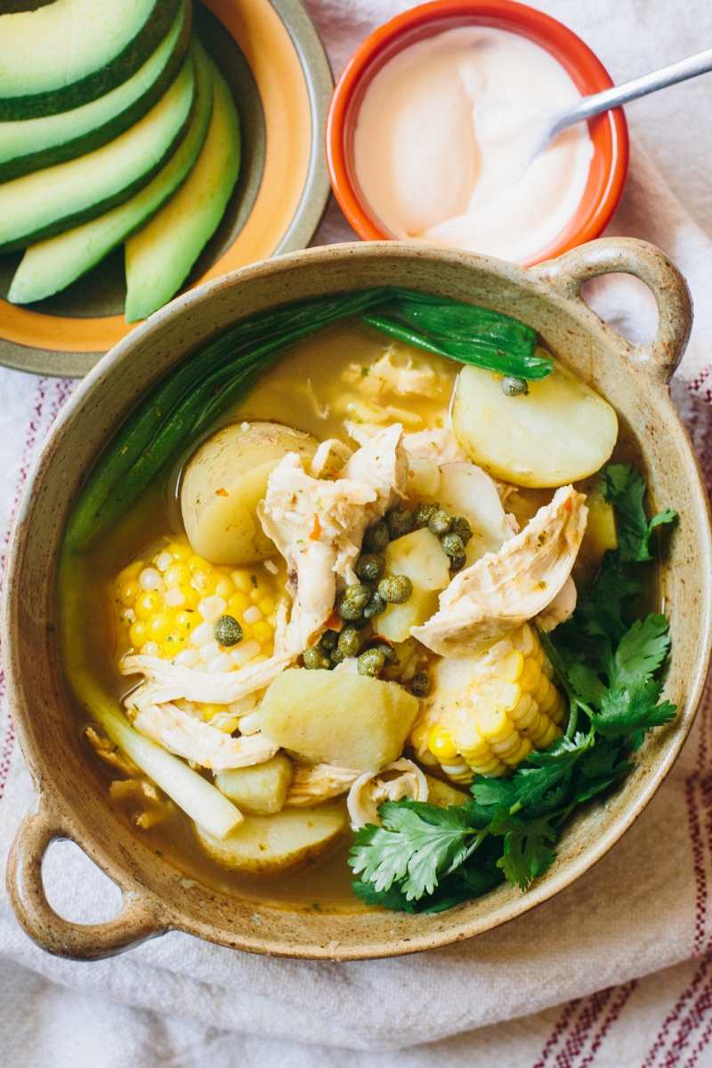 This recipe is modeled after the Colombian version of Ajiaco, which always features chicken, corn, and potatoes (and the aji pepper, of course!). Like peppers and potatoes, corn is native to the Americas. The Colombian version is also spiced with guasca leaves, which are in the daisy family and native to South America. If you can’t find these dried leaves at your local international market, you can easily find them online.