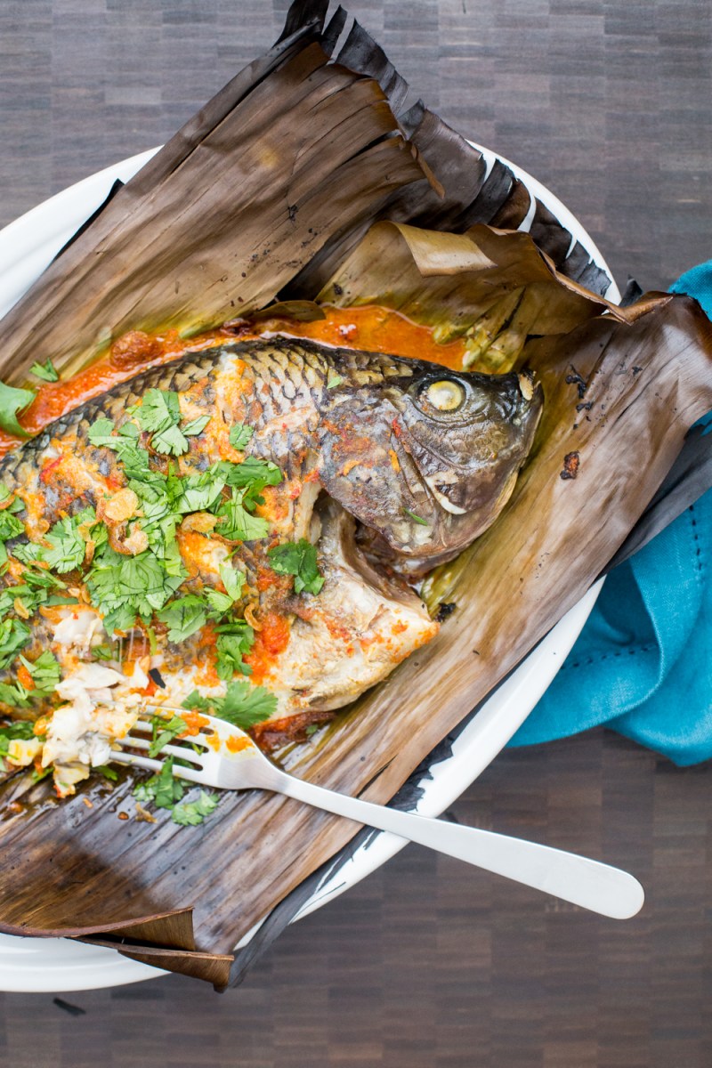 While this is a very exotic-sounding dish, it’s surprising that all of the ingredients can be easily found during a trip to your local Asian market. Banana leaves are commonly sold frozen in large sheets for very cheap – usually a dollar will get you as many as 20 leaves. Bear in mind that frozen banana leaves are more brittle than fresh, and don’t hold up to heat as well – so you’ll want to get plenty of them, at least five leaves per fish.