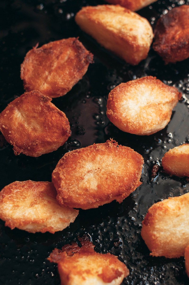 To get the perfect potato texture, we’re going to par-boil the potatoes to remove some of their starch and to soften them up; that way we can just blast the potatoes over a relatively high heat to crisp them up without worrying about whether they’re done on the inside. We’ll be frying them in duck fat, because it’s delicious, but lard, coconut oil, or any other high-heat oil will work just fine. In a separate pan, we’ll prepare the rest of the dish, then combine the two just before serving (otherwise, the potatoes would get mushy).