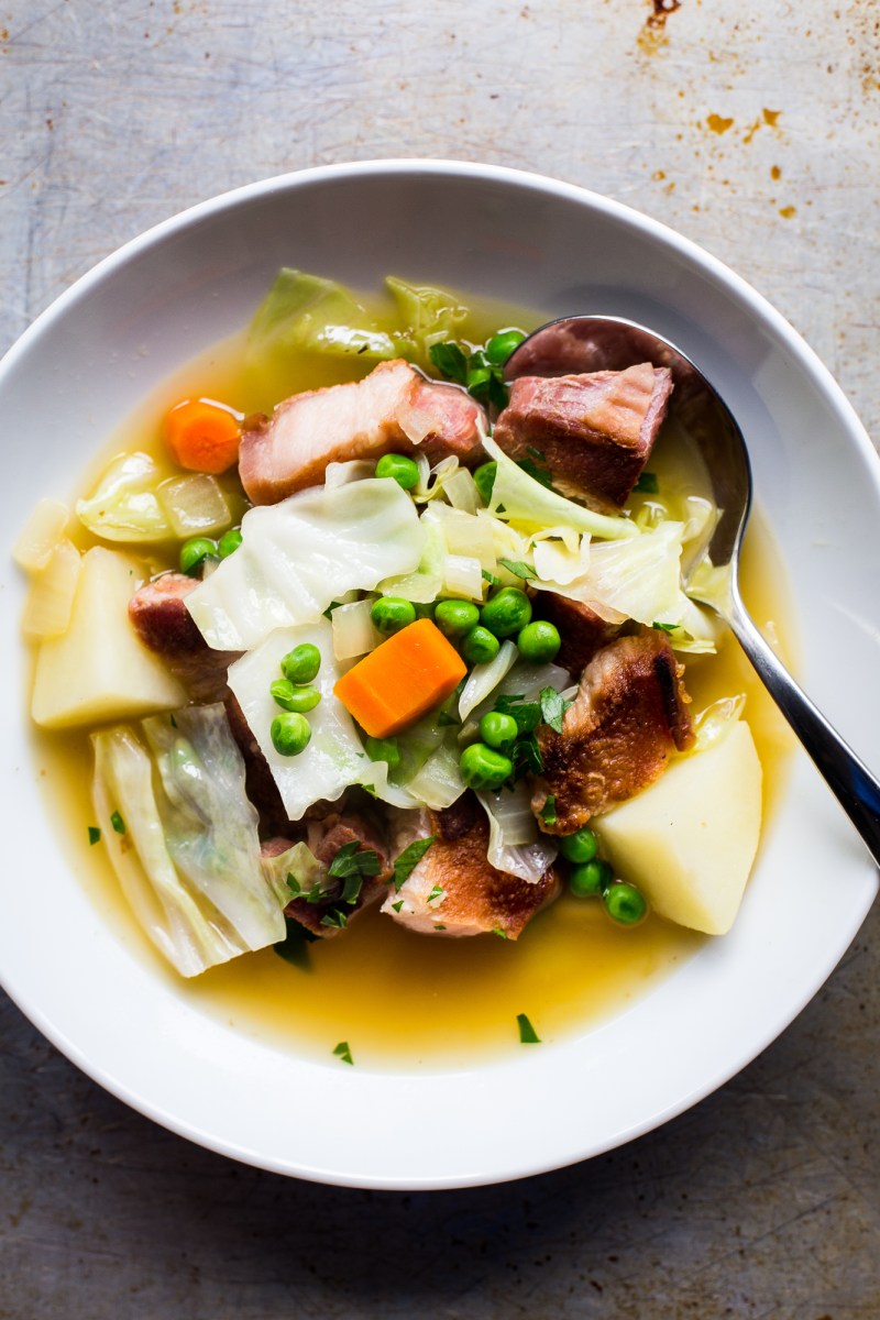 Garbure is a peasant’s soup originally from the Aquitaine (southwest) region of France; its defining ingredients include cabbage, meat (typically ham or duck), and seasonal vegetables like beans or peas. The consistency of the soup varies – some are nice and thick thanks to copious beans or chunks of bread (a good Garbure, I’ve read, should allow to spoon to stick up on its own), while others let cabbage provide the soup’s body.